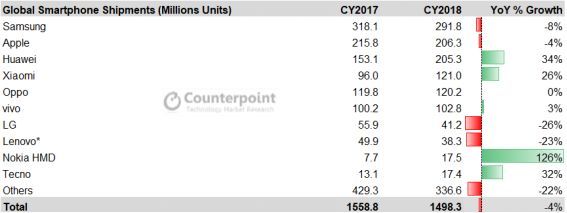 Counterpoint提供的数据基本与IDC一致,OPPO、vivo全年相较于2017年变动不大,分别微增1%和3%,以1亿左右的销量分居于第五位和第六位。