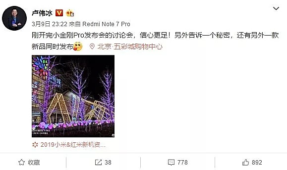 近日,小米集团副总裁、红米Redmi品牌总经理卢伟冰发微博称,刚开完红米Note 7 Pro发布会的讨论会,信心更足!另外他透露,还有另外一款新品同时发布。