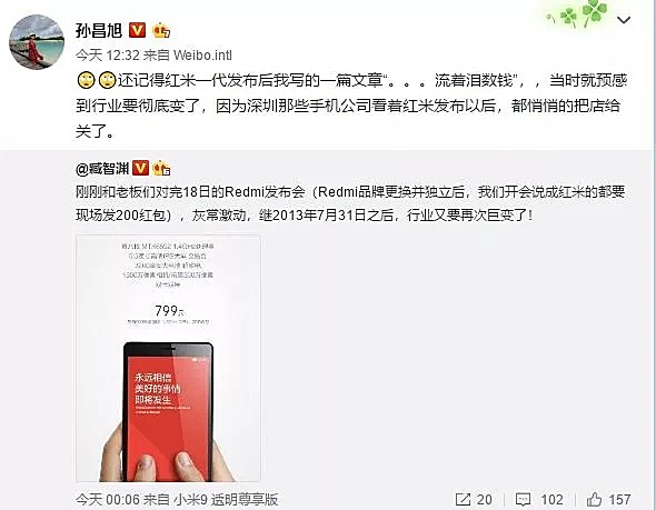 随后小米产业投资部合伙人孙昌旭转发该微博并称:“还记得红米一代发布后我写的一篇文章‘。。。流着泪数钱’,当时就预感到行业要彻底变了,因为深圳那些手机公司看着红米发布以后,都悄悄的把店给关了。”