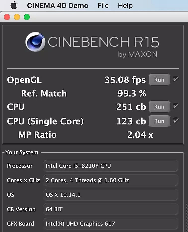 根据Cinebench R15的测试来看,Core i5 8210Y多核251分、单核123分,这并不是一个特别强力的数据,与老款MacBook Air使用的Core i5 5350U基本相当,而Core i5 8250U大多数笔记本可以轻松跑到多核500+和单核140+,换言之,全新MBA的性能定位依然是轻负载移动办公,有更高需求就得考虑MacBook Pro 13甚至MacBook Pro 15。
