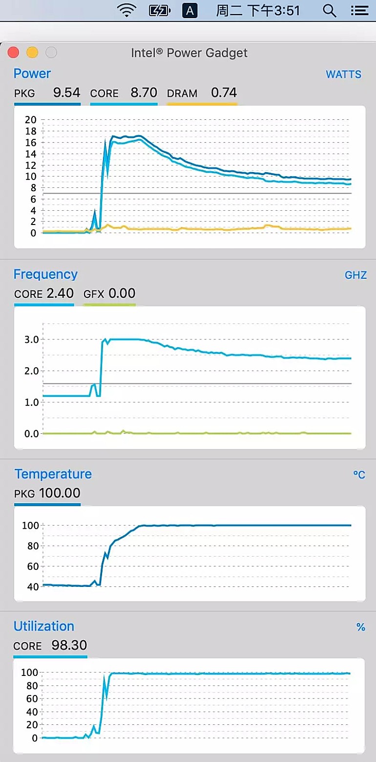 而在Cinebench R15的多核测试中可以看到,全新MBA在测试刚开始时处理器封装功耗可以到17W,随后会逐步下降到10W左右,处理器频率也会从一开始的3GHz下降到2.4GHz,但温度会提升到100℃左右并保持,而且这个过程还是很迅速的,在Cinebench R15两分钟左右的测试过程中,键盘面的温度主要集中在数字键6、7、8和F6、F7键和更往上的区域,基本不会影响到常规的键盘操作区域。