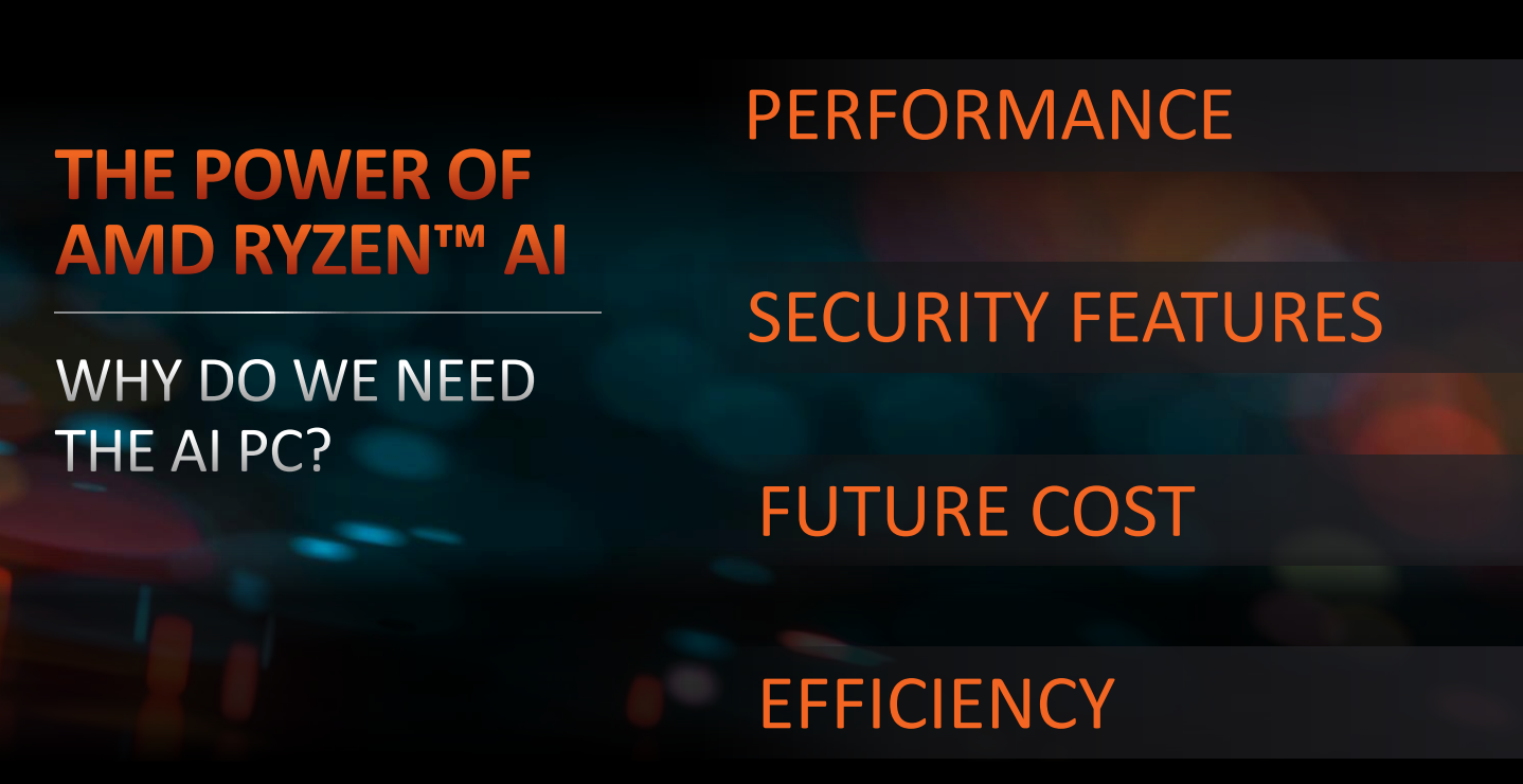 我们为什么会需要AI PC呢?AMD列出了几大理由。首先,AI处理器能够在本地AI计算中提供相比传统处理器更加高效的计算效率,让AI应用达到流畅使用的水平;其次,AI处理器能够提供更强大的安全功能,保护用户的数据安全;再次,AI处理器能够有效降低用户在AI应用上投入的成本;最后,AI处理器在本地AI计算方面的能效比优势明显。而所有这些优势,都可以通过拥有Ryzen AI引擎的锐龙8040系列AI处理器来实现。