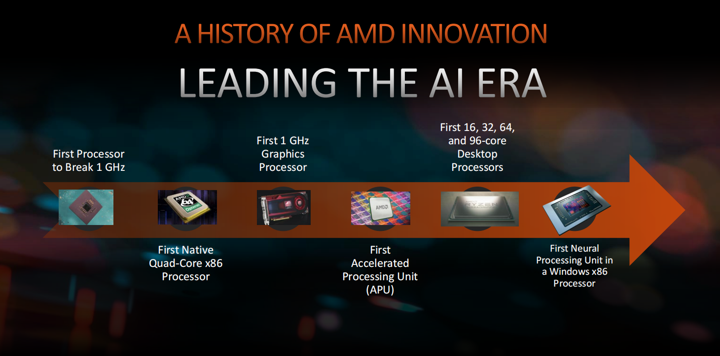 在PC芯片发展史上,AMD创造了多个世界第一,包括首颗频率达到1GHz的处理器、首颗原生四核处理器、首款频率达到1GHz的GPU、首颗APU、首款16/32/64/96核桌面处理器……直到去年,AMD更是推出了首款内置神经计算单元的X86处理器,开创了AI PC的先河。