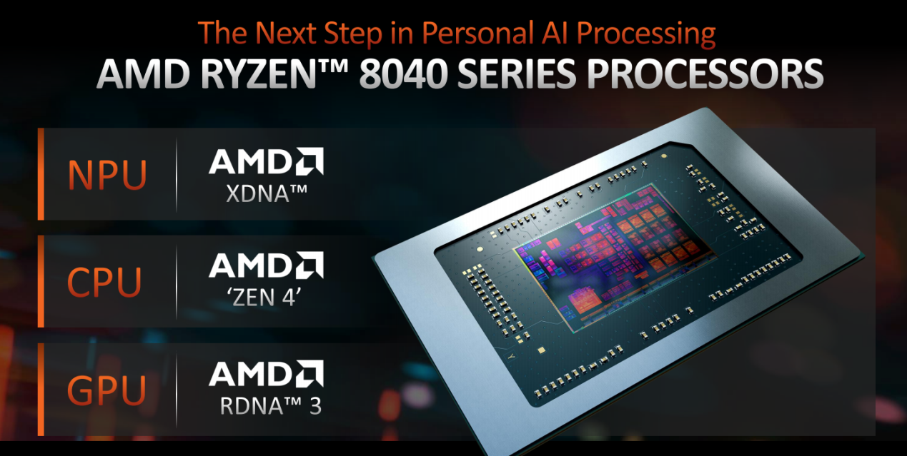 个人AI计算应用应该依靠什么样的硬件?其实早在去年AMD就已经给出了答案,那就是同时拥有NPU(XDNA架构)、CPU(Zen 4架构)、GPU(RDNA 3)架构的锐龙7040系列移动处理器。而现在,锐龙8040系列终于登场,这三大特性进一步得到凸显。