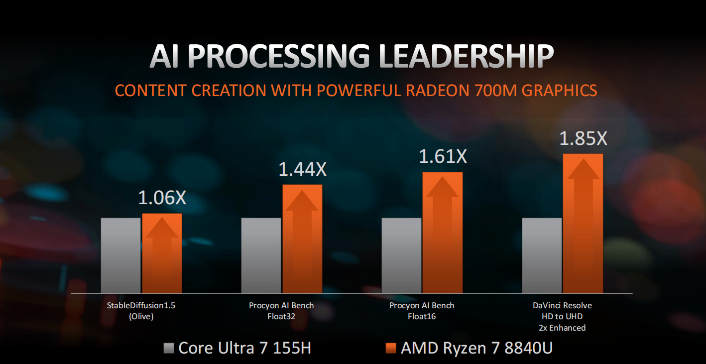 前面已经说过,锐龙8040系列的AI加速计算包括三大部分,除了采用Ryzen AI引擎的NPU之外,内置的RDNA 3显卡也非常强悍。从官方公布的对比数据来看,锐龙7 8840U内置的Radeon 780M在Stable Diffusion1.5中超越Core Ultra 7 155H大约6%;在Procyon AI(Float32/Float16)测试中分别领先44%和61%;在达芬奇转码中领先85%。就这个表现来讲在业界也是领军级的存在。