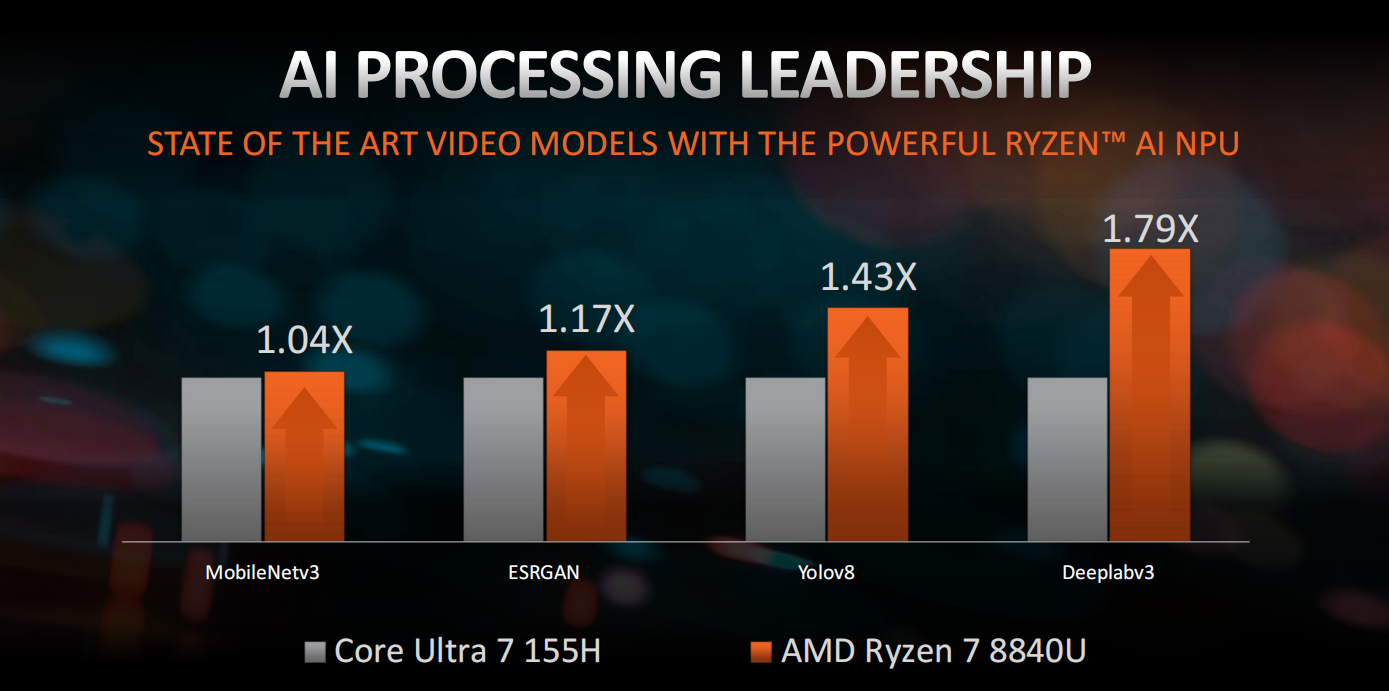 AMD在发布会上展示了锐龙7 8840U的部分性能对比数据,首先是AI处理性能方面,我们可以看到,在MobileNetv3中,锐龙7 8840U领先了Core Ultra 7 115H大约4%;在ESRGAN中大约领先了17%;在Yolov8中大幅领先了43%;在Deeplabv3中甚至领先了79%之多。由此可见,Ryzen AI架构的NPU在AI计算效率方面确保了业界领先的水平。