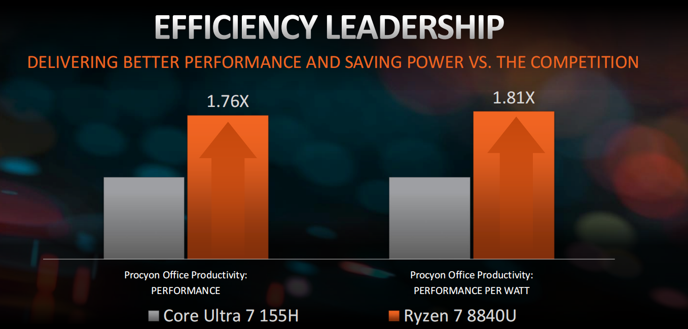 能效比方面,锐龙8040系列处理器也继续保持了业界领先的水平。从数据来看,在运行Procyon Office Productivity时性能大幅领先Core Ultra 7 155H大约76%,换算成每瓦性能更是领先了81%,这对于移动办公用户来说非常重要,直接决定了笔记本在主流负载下的续航能力,而从锐龙7 8840U的表现来看,这方面它无疑是业界领先的存在。
