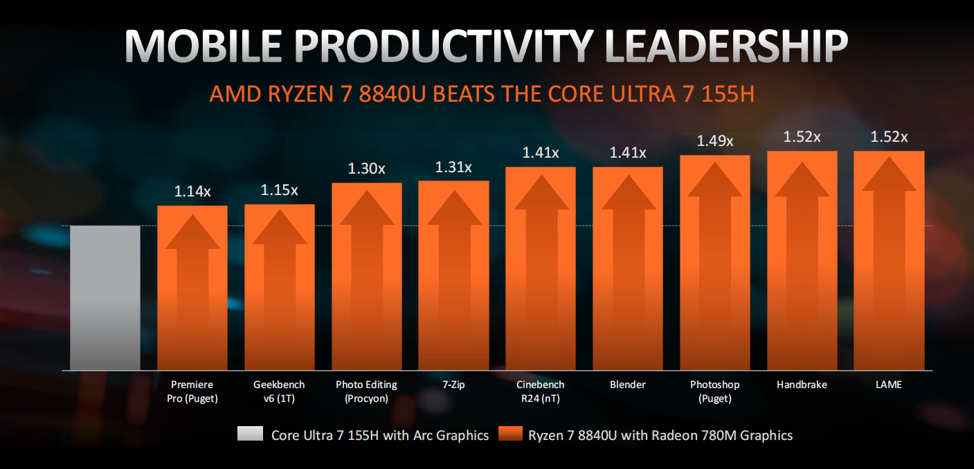 再来看看生产力方面的表现。从官方对比数据来看,锐龙7 8840U在主流的生产力测试与工具软件中都明显领先了Core Ultra 7 155H,最低领先幅度都达到了14%,最高领先幅度甚至达到了惊人的52%,由此可见,锐龙8040系列进一步稳固了AMD在商务高性能轻薄本市场中的领导地位。