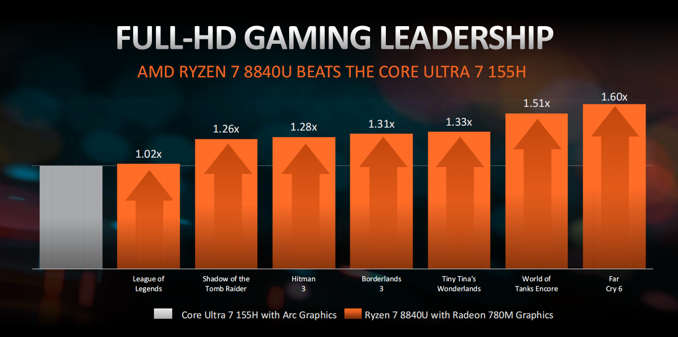 游戏性能方面,锐龙7 8840U依靠高效的Zen 4架构处理器加上Radeon 780M显卡,为玩家提供了相当给力的FHD游戏性能,从官方对比数据来看,领先了内置Arc核显的Core Ultra 7 155H最多60%,其他游戏也有平均20%以上的领先幅度,可以说明显高出了两个身段,这也意味着在2024年的轻薄本市场,AMD锐龙8040系列依旧保持着大幅领先的游戏性能水平。