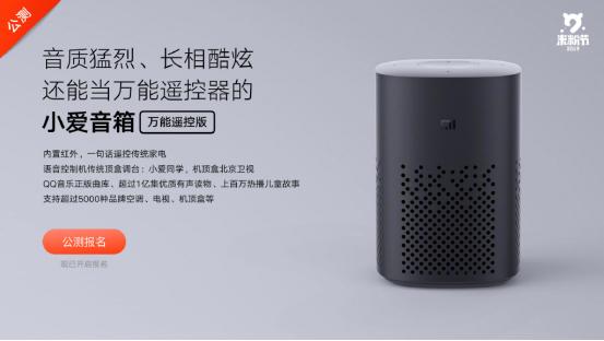 此外,他们又开启了另一款小爱音箱的公测报名,这款万能遥控版的主要特点在于,音箱内置了红外遥控功能,通过语音就能直接遥控传统家电,当然,这款音箱就没有屏幕了,造型更加传统一些。