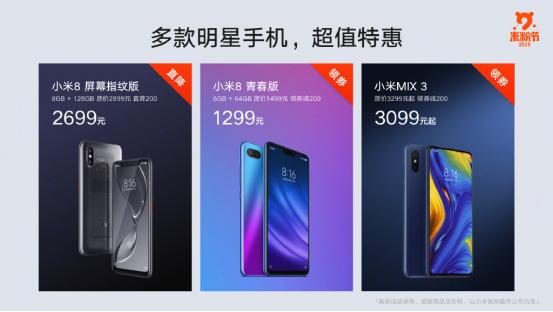 尤其是相对核心的手机方面,去年几款热门手机都迎来了价格直降,包括小米8屏幕指纹版、小米8青春版、小米MIX 3等,购买指定的手机除了能加1元换购福袋,也可以加199元换购小爱音箱。
