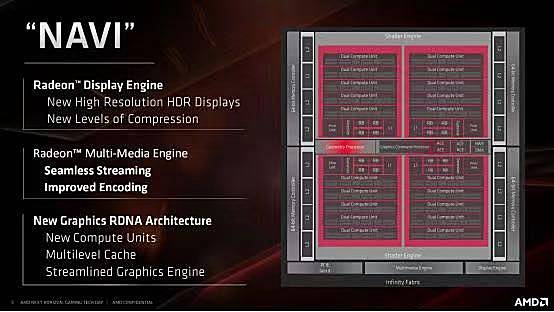 代号NAVI的新一代Radeon RX 5700系列GPU其实在架构方面包含了3大组成部分。首先是Radeon Display Engine,包含对新一代高分辨率HDR显示技术的支持和新一代压缩等级;其次是Radeon Multi-Media Engine,包括无缝串流和改进后的编码;最后的主角就是全新设计的RDNA图形架构,包括新的计算单元、多级缓存、高效图像引擎。