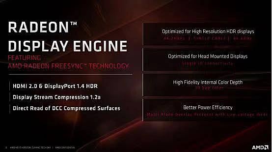 Radeon Display Engine显示引擎的重要特性包括了提供HDMI 2.0及DP1.4 HDR接口,Display Stream Compression 1.2a(显示流压缩技术),DCC压缩表面直读技术。在这个显示引擎的支持下,Radeon RX 5700系列显卡可以单数据线支持4K 240Hz/8K 60Hz显示模式,为单IO头戴显示器提供优化,30bpp色彩和更高的能效。