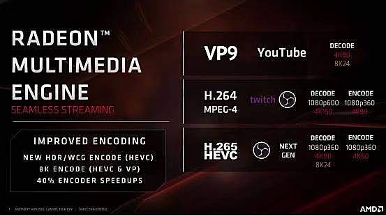 Radeon Multimedia Engine则大大提升了Radeon RX 5700系列显卡的编码能力,支持新一代HDR/WCG编码、8K视频编码,编码性能提升了最多40%。