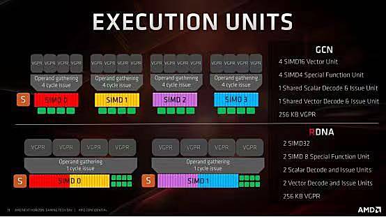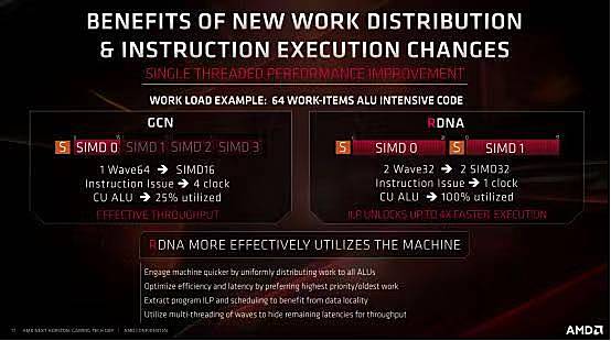 全新RDNA计算单元专为提升单线程性能而设计,和之前GCN的结构相比在数据处理上有所不同。GCN支持SIMD16的Wave64模式,而RDNA支持双SIMD32的Wave32模式,因此GCN需要4个周期才能完成的Wave64,RDNA可以使用一个周期就搞定,效率自然大大提升。当然,如果Wave数量大于64,两者的效率会逐渐接近,Wave数量越小,RDNA的优势越明显。