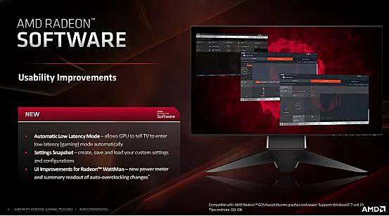 新版驱动的易用性也得到了大幅度增强。首先,支持自动低延迟模式,能够让GPU通知电视进入游戏低延迟模式;其次,可以保存和载入显示设置,免得每次都要自己调节;Wattman界面调整,加入了新的功耗仪并能读取自动超频的日志。