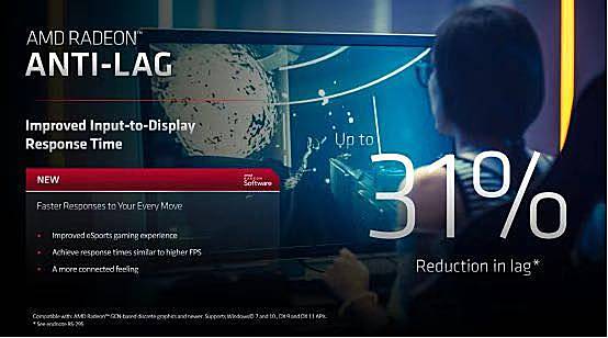 增加了AMD Radeon ANTI-LAG功能,可以有效降低输入操控到显示画面的延迟。从现场的演示DEMO机来看,配备Radeon RX 5700 XT的主机输入延迟在39ms,而配备RTX2070的主机输入延迟为56ms,可见A卡新驱动这项功能确实能大幅度降低玩家的输入延迟,提升操作的流畅度。