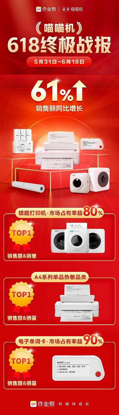 6月20日,科技公司作业帮发布618销售战报。数据显示,在今年618期间,作业帮喵喵机全系列产品,整体销售额同比增长61%。其中,学习打印机市场,以喵喵机F1、F1S、F2S为代表,环比上一个月,销售量增长300%,销量及销售额均获品类第一,领跑学习打印机品类;错题打印机市场,以喵喵机P1、P2、P3为代表,市场占有率超80%;电子单词卡市场,以喵喵机E1为代表,市场占有率超90%。