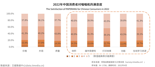 检验一款好的产品,除了销售数据以外,用户的口碑也是必不可少。据艾媒咨询今年发布的《2022年中国家用学习打印机创新趋势研究报告》显示,对于喵喵机系列的打印效果、在线学习资源以及外观,超四成用户给予最高满意度评价,操作简便性和功能的整体满意度也较高。