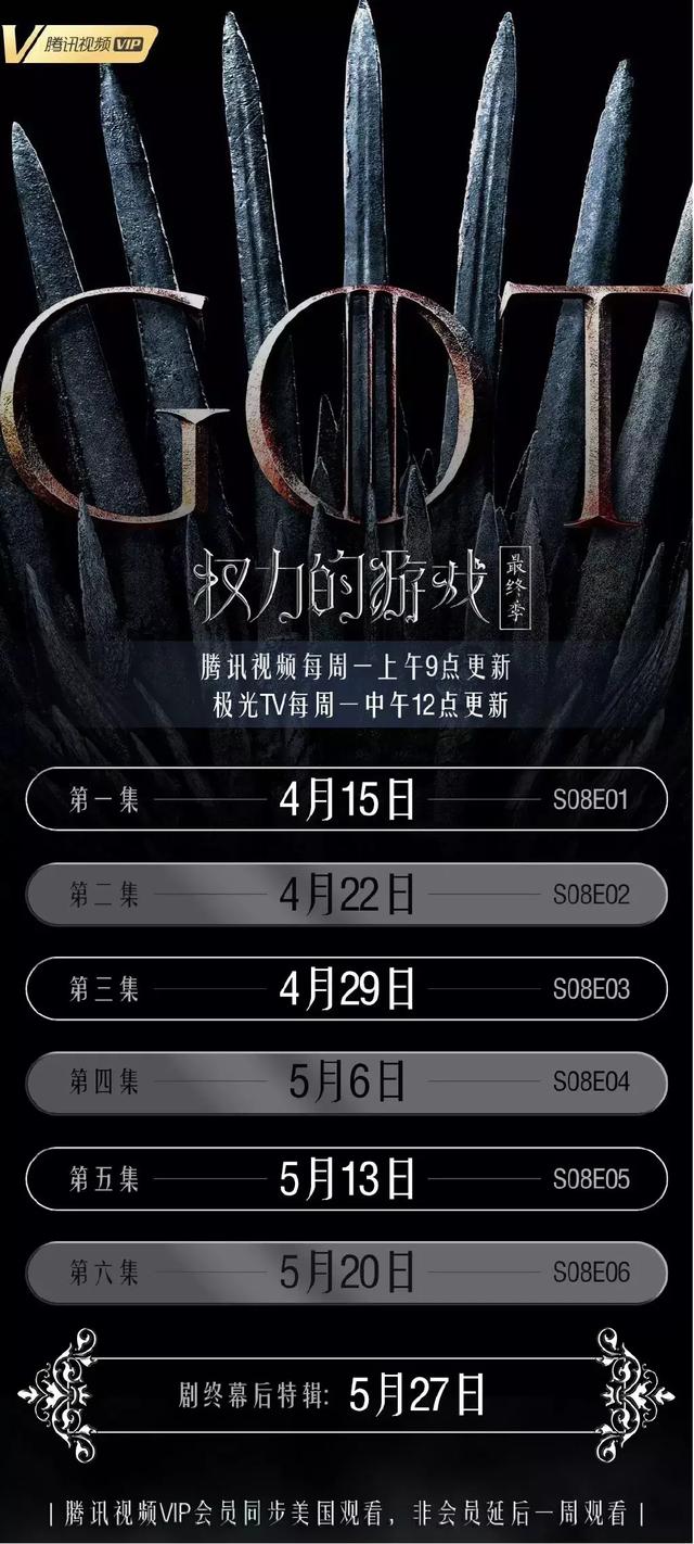 而这次腾讯视频已经提前拿到片源,并完成了相应的准备工作,基本上都能在每周一上午准时上线,与北美时间同步开播。再加上这一季又是整个系列的大结局,能早一点看到权游的进展当然是最重要的了。