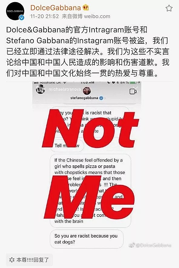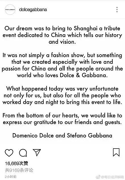 面对这样的结果,D&G官方微博发文表示,D&G和班纳的Instagram账号都被盗,“我们已经立即通过法律途径解决。我们为这些不实言论给中国和中国人民造成的影响和伤害道歉。我们对中国和中国文化始终一贯的热爱与尊重。”
