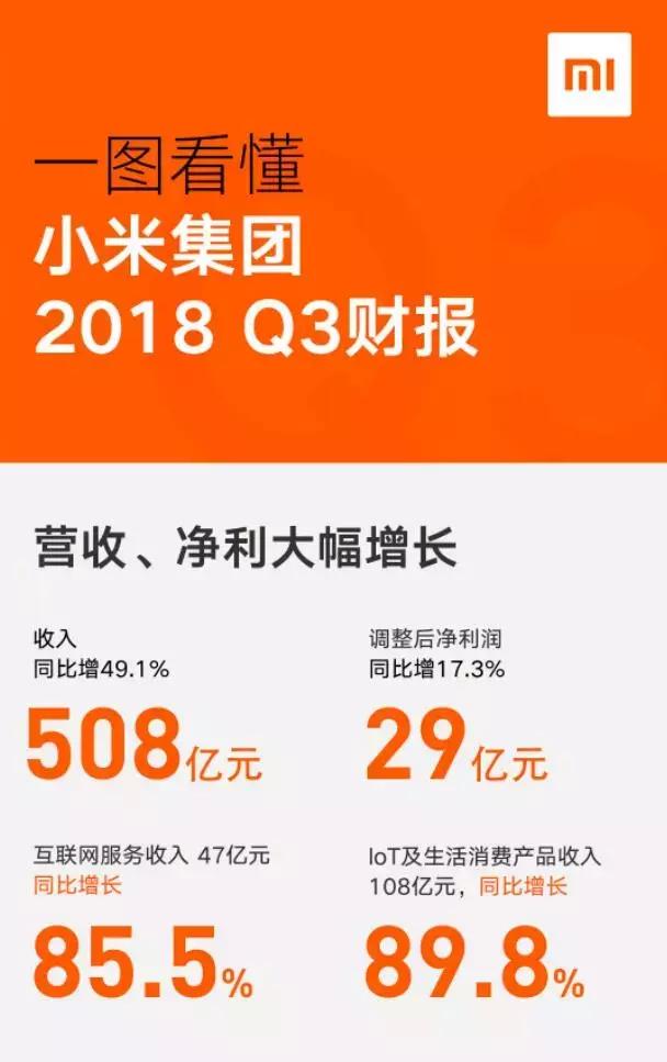 财报显示,第三季度小米集团实现营收508.46亿元,同比增加49.1%;实现经调整净利润28.85亿元,同比增加17.3%。