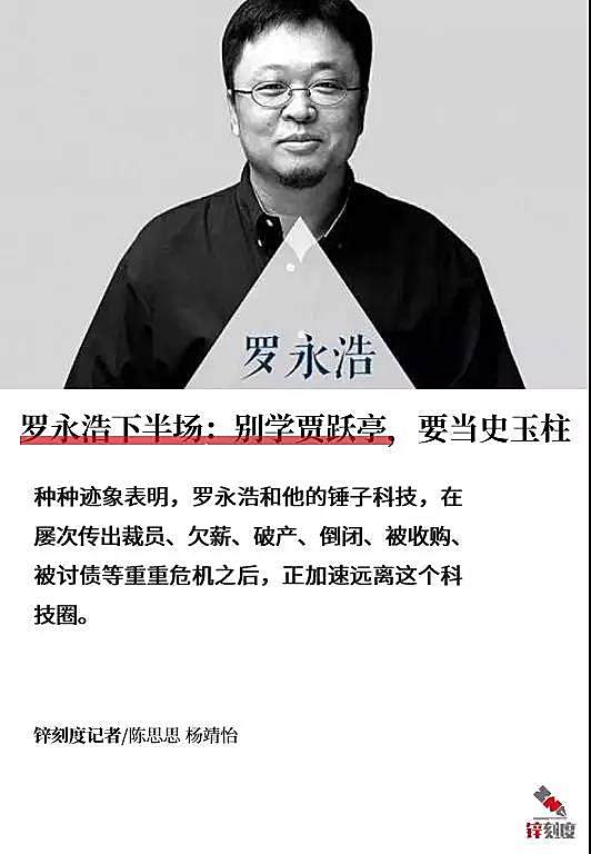 只是,对罗永浩而言,如果锤子的失败已无可避免,他的下半场,是做卧薪尝胆东山再起的史玉柱,还是效仿彻底崩塌仍继续忽悠的贾跃亭?