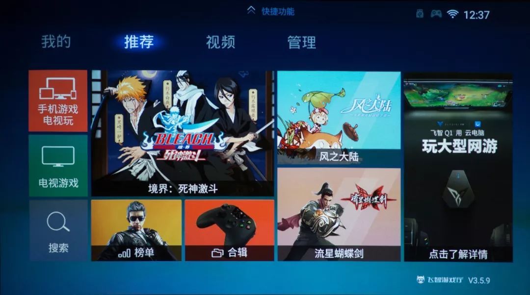 游戏娱乐是智能家用投影有别于传统电视的重要改变,借助游戏平台,明基i705能够实现“秒变”客厅游戏主机的应用,其系统本身预置口碑不错的“飞智游戏厅”,用户可通过游戏手柄、手机登多种操控模式进行游戏。