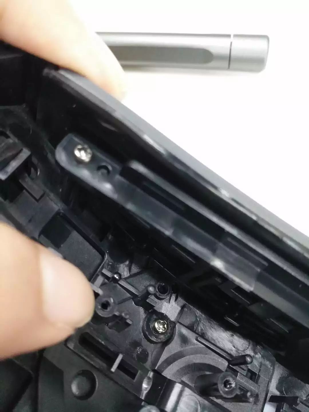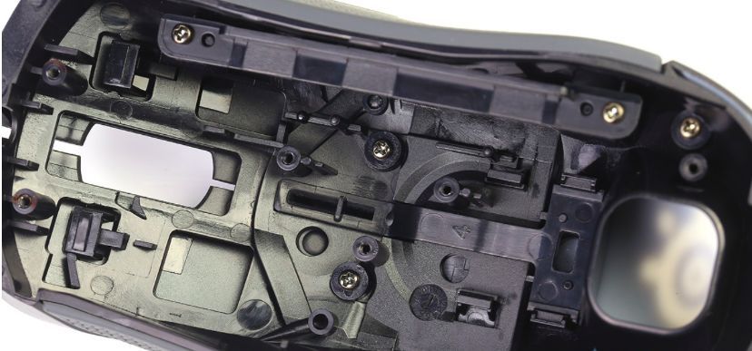 顶盖虽然平时被玩家更多了解的是外表涂层,但实际上其却是鼠标侧键、重量平衡、内部光线处理等细节问题的关键,Rival 310顶盖设计复杂度可见一斑,可以看到多处卡扣和螺丝固定分体式按键、DPI键、侧键和尾部外壳。
