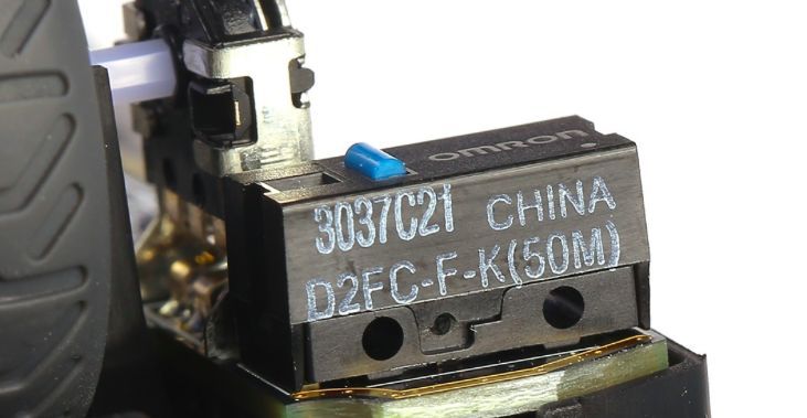 微动可以说是大众玩家最为关注的点了,小狮子拆开第一时间也对微动进行了观察。赛睿Rival 310中键采用了方形微动,左右按键采用了欧姆龙D2FC-F-K(50M)微动,寿命高达5000W次,是欧姆龙旗下点击寿命最高和个体差异最小的微动,能给玩家提供最为一致的手感和耐用度。