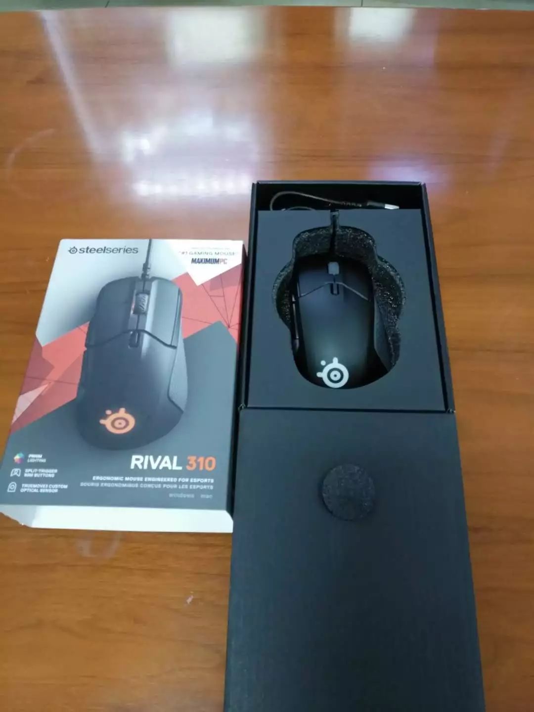 抽拉式包装设计,取下标签套以后通过掀盖打开包装,就可以看到赛睿Rival 310,作为一家专业鼠标厂商,赛睿似乎一直不太喜欢把包装设计得太过张扬,朴实内敛的风格倒是很适合成熟游戏玩家。