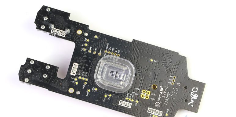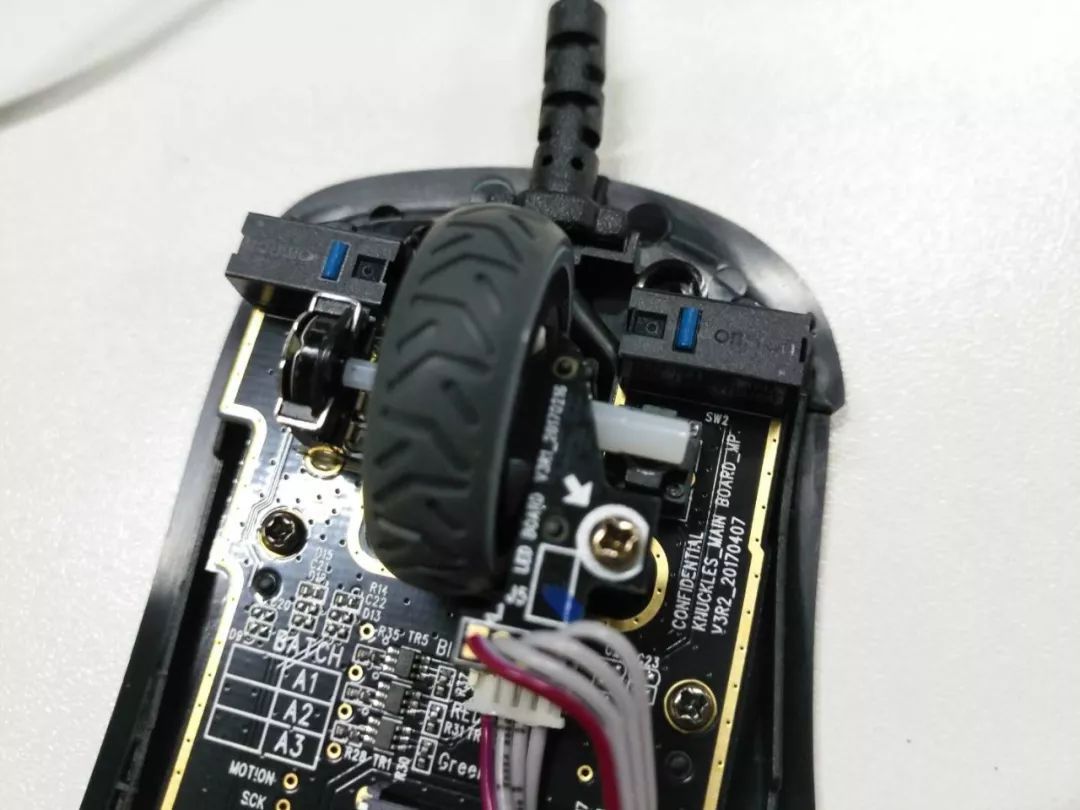 前面我们提到,Rival 310使用了两块PCB板,位于顶盖的PCB主要负责鼠标侧键的使用,单独的PCB有点意思,其底部使用了主PCB板一样的黑色处理,充分体现了赛睿对细节的高要求。