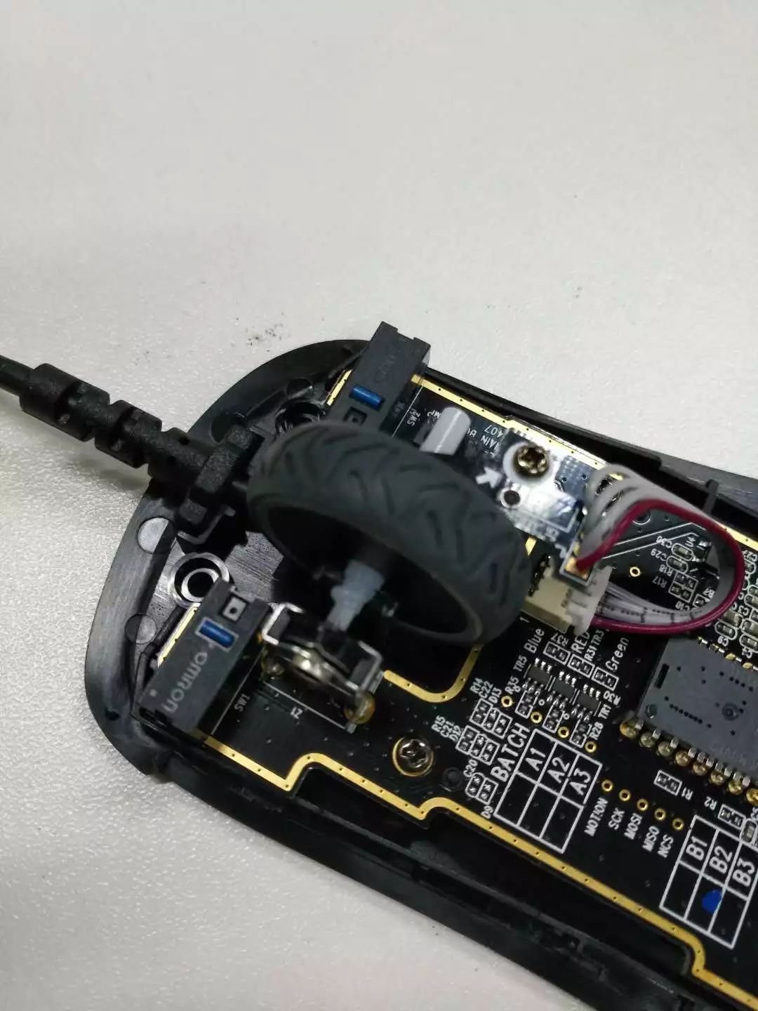 这样的撬口没太多技术含量,毕竟小开口对于鼠标重量的影响微乎其微,不过处理不好,固定螺丝很容易被氧化,大多数低价鼠标是不会做这样的设计的,毕竟在磨具上动很小一个细节都需要付给代工厂相应成本,公模更受厂商欢迎一些。