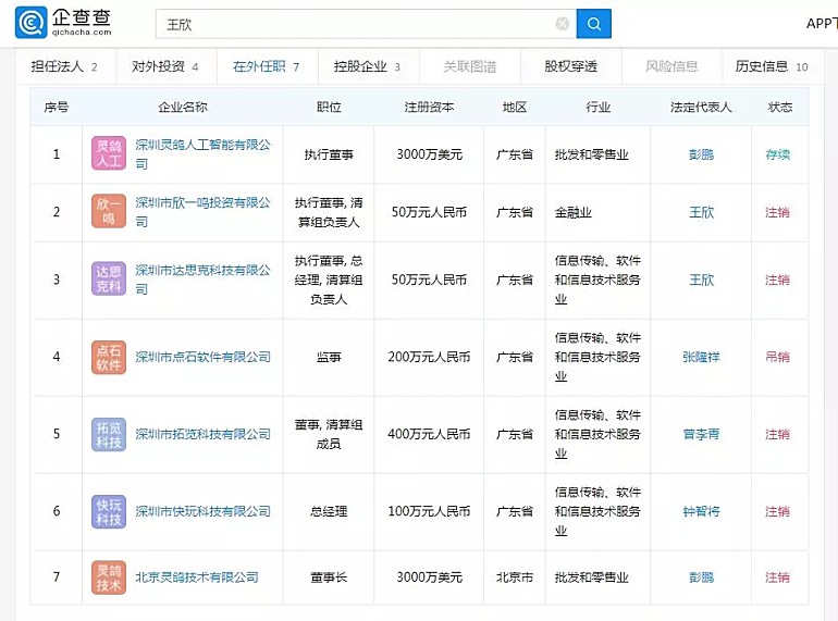 据企查查显示,王欣现在在两家公司担任法定代表人,并且对外投资了四家公司,总共任职于7家公司,但如今6家公司已注销。