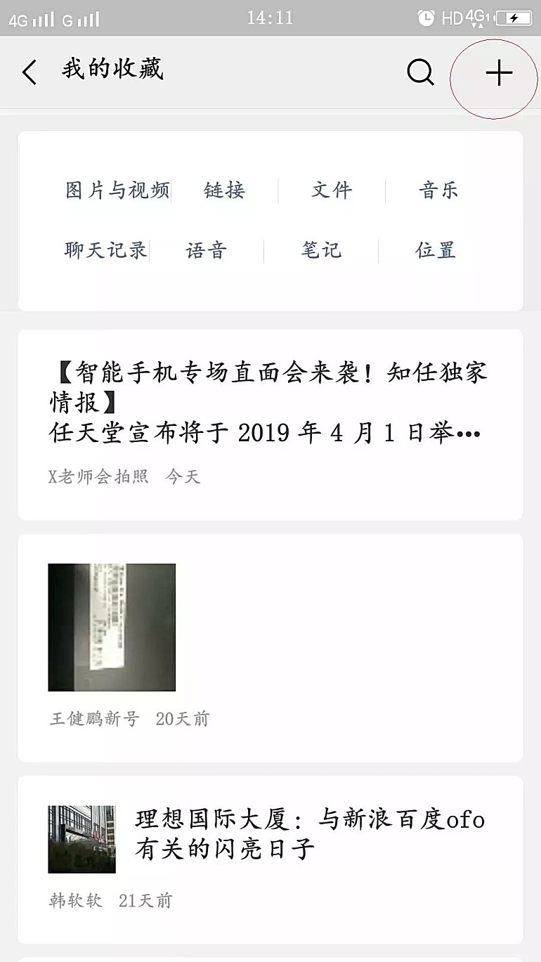 在微信上依次点击“我”——“收藏”,然后点击右上角的“+”: