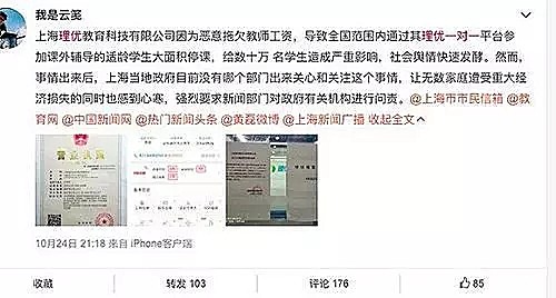 同是10月,主打小初高学生在线1对1培训的上海理优教育科技有限公司被曝停课,负责人跑路,拖欠员工工资,学员费用无法退还。
