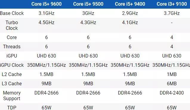 四核的酷睿 i3-9100 是个特例,因为它似乎不支持睿频。与上一代酷睿 i3-8100 相比,其基础频率也象征性地提了一丢丢。