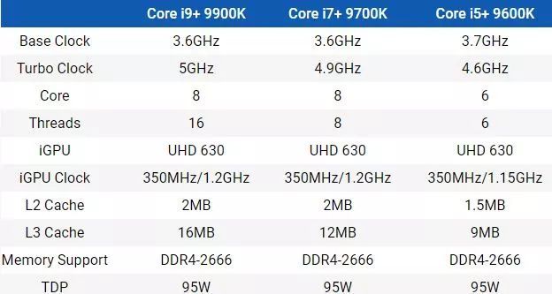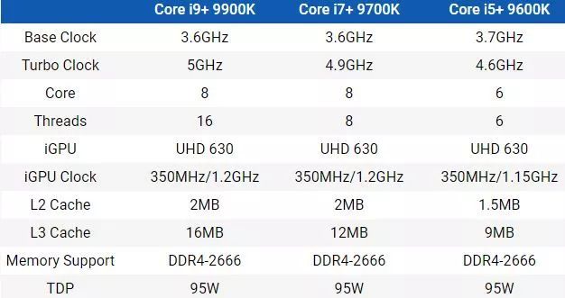 让人有点失望的是,与 8 代内核相比,9 代酷睿依然挤起了牙膏(毕竟只是 Coffee Lake 的 Refresh)。时钟频率仅提升了 100 / 200MHz,这显然难以勾起人们的购买欲。