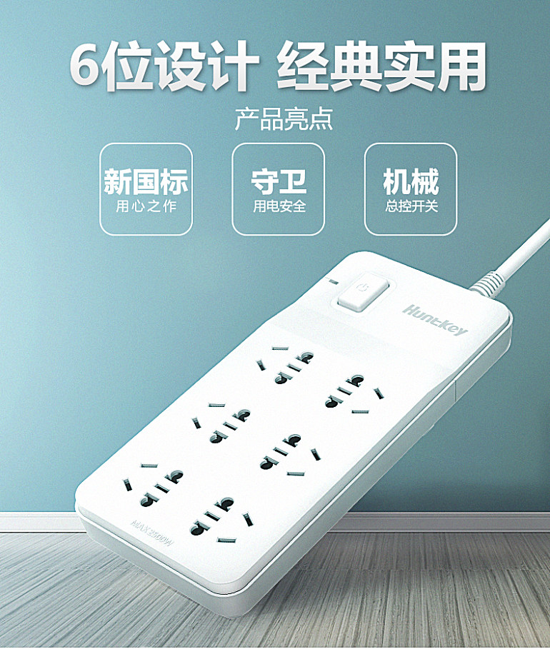 航嘉家用六位新国标多功能插座SSU601采用新国标组合插孔,6孔位额定功率高达2500W,兼容各种插头,拥有极好的适应性。儿童保护门的设计贴心有安全,能够有效避免儿童手指或小物件误触电,升级的线径配以高阻燃、超耐热材料,拥有非常好的安全性。