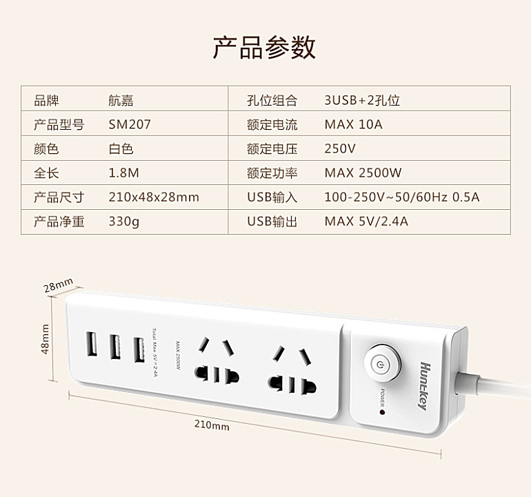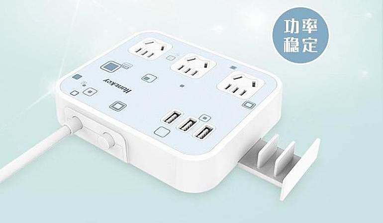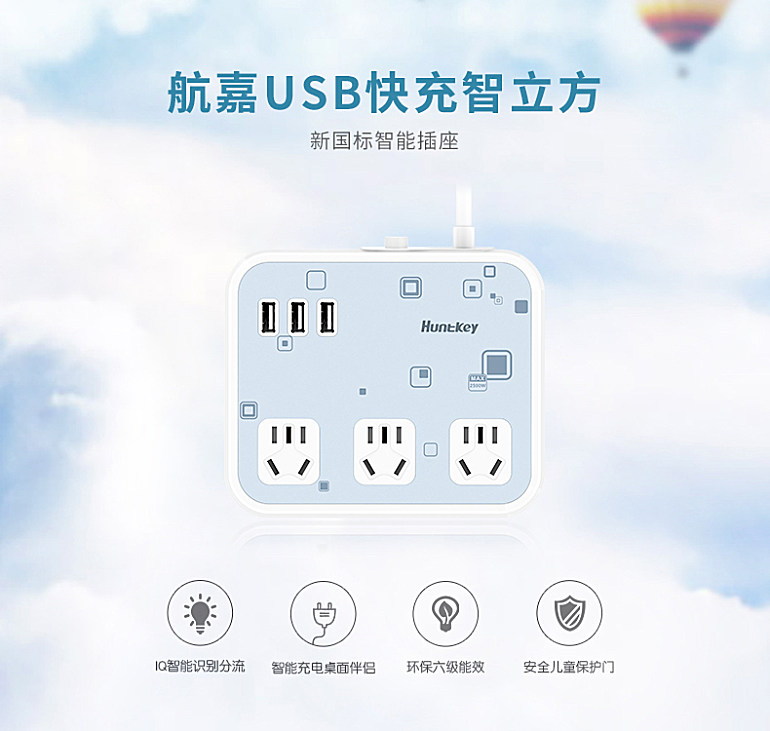 航嘉新国标USB智能排插sm207的亮点在于智能USB充电,单个USB输出电流最大2.4A,内有多重充电保护,可有效避免过流伤害手机,从而延迟电子设备的使用寿命。