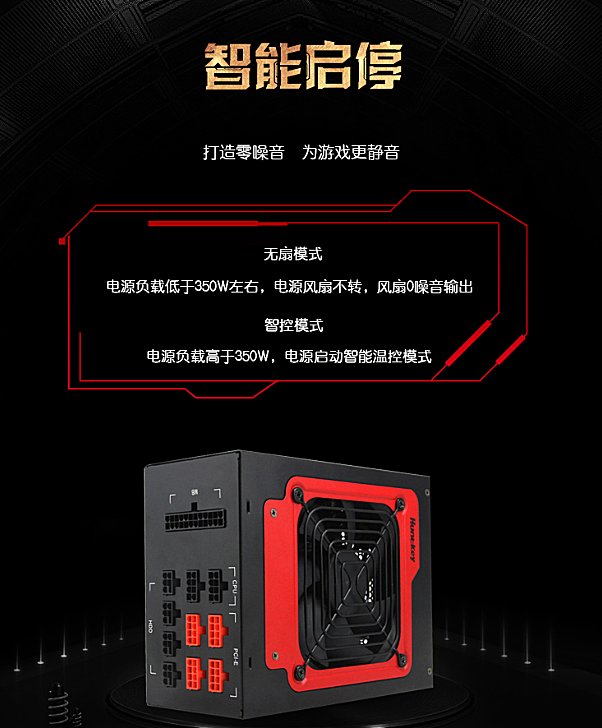 航嘉MVP K1000金牌电源采用风扇智能启停技术,散热性能卓越,保证散热>10W每小时,同时搭配智能温控滚珠风扇,40℃高温下连续无障碍大于70000小时,当电源负载低于350W时,电源风扇不转,真正做到低功耗,零噪音,为用户打造静音舒适的使用环境。