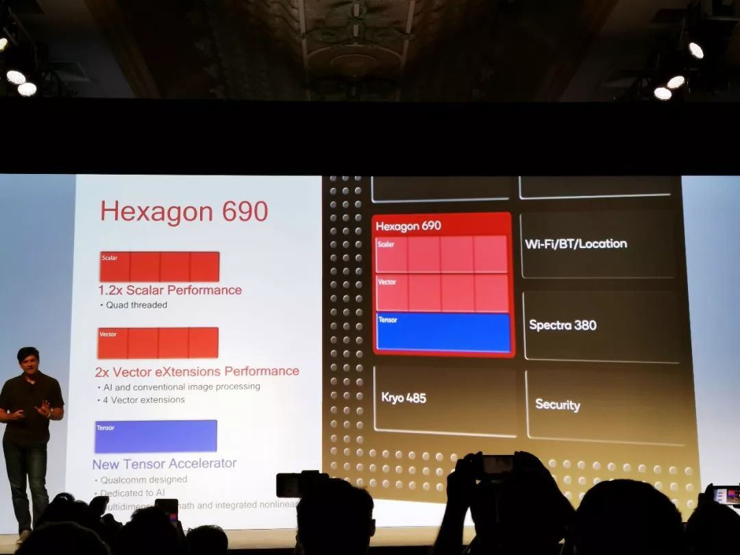 全新的高通Hexagon 690处理器包含一个全新设计的Hexagon张量加速器(Hexagon Tensor Accelerator,HTA)和4个Hexagon向量扩展内核(Hexagon Vector eXtensions,HVX),是前代旗舰产品向量处理的两倍,并且还增加了四线程标量内核,综合实现了专有的、可编程的AI加速。