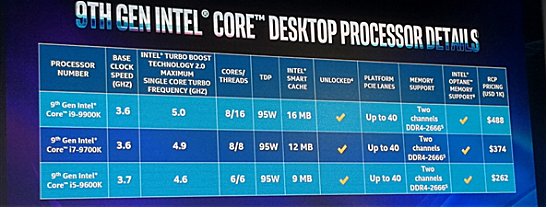 具体型号方面,第九代酷睿旗舰型号为Core i9 9900K,8核心16线程,三级缓存为16MB,基准频率3.6GHz,睿频加速最高5.0GHz,集成核芯显卡UHD 630,支持双通道DDR4 2666,热设计功耗为95W,售价488美元,相比Core i7 8700K增加了129美元(增加34%)。Core i7 9700K具备 8核心8线程,三级缓存为12MB,频率范围为3.6~4.9GHz,价格为374美元,比i7-8700K贵了15美元(增加4%)。Core i5 9600K为 6核心6线程,三级缓存9MB,频率范围为3.7~4.6GHz,价格为262美元,相比于Core i5 8600K贵了5美元。