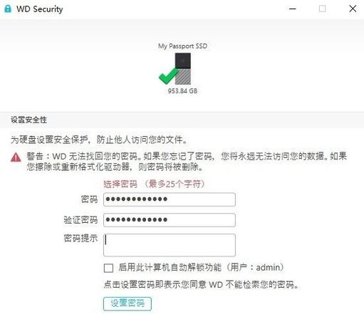 当你把电脑里的资料转移到移动SSD之后,你就可以使用WD Security为硬盘设置密码,除非你开启了计算机自动解除密码的功能,否则必须输入密码才能进入硬盘,如果你忘记密码,或者丢失硬盘,在连续输入密码错误五次以后,硬盘便会自动清空(需在设置中授权),让你的数据更加安全。