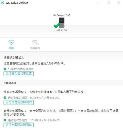 数据安全的前提是硬盘完好无损。安装了WD Discovery软件之后,可以看到WD My Passport SSD提供了自有监测软件WD Drive Utilities来帮助用户查看硬盘的安全状态。