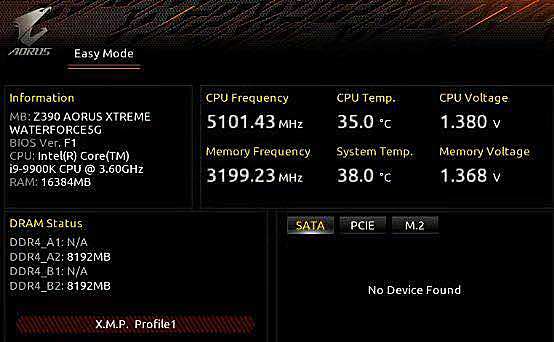技嘉这套顶级水雕5G套装其实并非简单地将技嘉Z390 AORUS XTREME WATERFORCE5G主板和酷睿i9 9900K绑定在一起,而是真正地在主板中加入了超5.1GHz的选项,而且默认状态就是打开的。装机完毕后,我们进入主板BIOS就可以看到,CPU频率已经是全核心5.1GHz了(电压默认1.35V),而且“9900K ALL Core 5.1 GHz OC”选项默认处于开启状态,由此可见,玩家只要把这套顶级水雕板U套装装好机,开机就能直接享受全核心5.1GHz的极致性能。