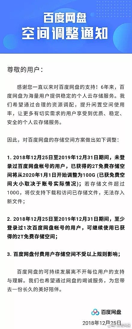 2018年12月25日至2019年12月31日期间,未登录过百度网盘帐号的用户,已获得的2T免费存储空间将从2020年1月1日开始调整为100G;若存储文件超过100G,将仅支持下载和访问已存储文件,无法存入新文件。