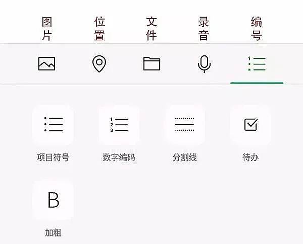 在这里,从左到右依次是图片/视频、定位位置、文件、录音、编号,就像一个简单版的Word文档。也许你会认为界面看起来太过简单。