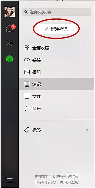 打开电脑版的微信,在左侧菜单栏中找到【收藏】,点击“新建笔记”,即可弹出一个独立的“笔记”页面,这样我们就可以边微信聊天边写笔记,完全不用担心中途退出界面而导致内容数据消失。