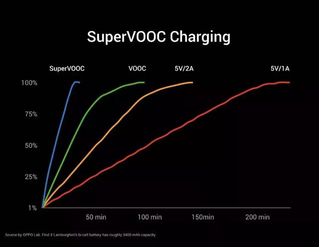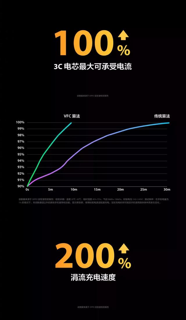 在SuperVOOC超级闪充系统中,OPPO第一次采用了3C电芯和VFC快充算法。3C电芯电流承载能力提升100%,素质过硬,更提高了安全系数;VFC算法改进涓流充电,涓流充电速度提升200%,大幅缩短最后10%的充电时间,真正实现“无差别”闪充体验。